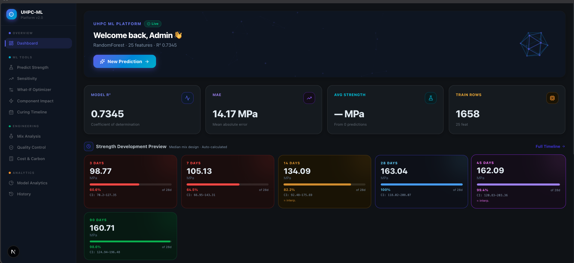 SHAP attribution made the model interpretable: engineers saw exact feature impact values (φᵢ) for each mix ingredient — silica fume contribution, fibre reinforcement effect, W/C ratio influence. Reduced physical lab testing cycles from weeks to a single afternoon. Screened hundreds of UHPC formulations computationally before any concrete was poured.